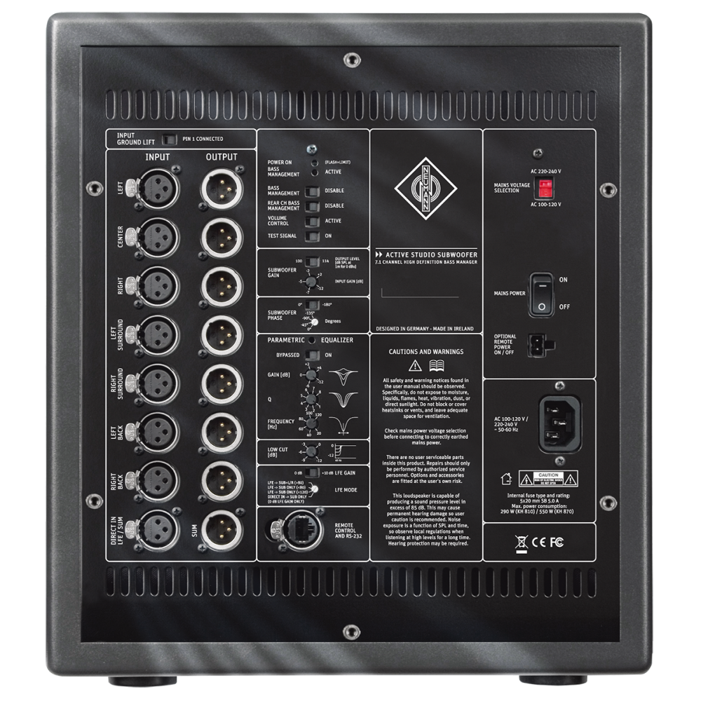 O KH 810 possui um 7.1 High Definition Bass Manager que pode ser ignorado com controle de volume remoto, quatro modos de roteamento, crossovers de quarta ordem e controles acústicos adaptáveis. Desde mono a 3D, o KH 810 pode ser usado em muitas configurações de sistema diferentes.