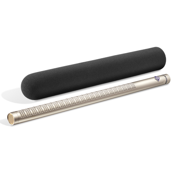 Microfone shotgun altamente direcional para gravação de distâncias maiores.