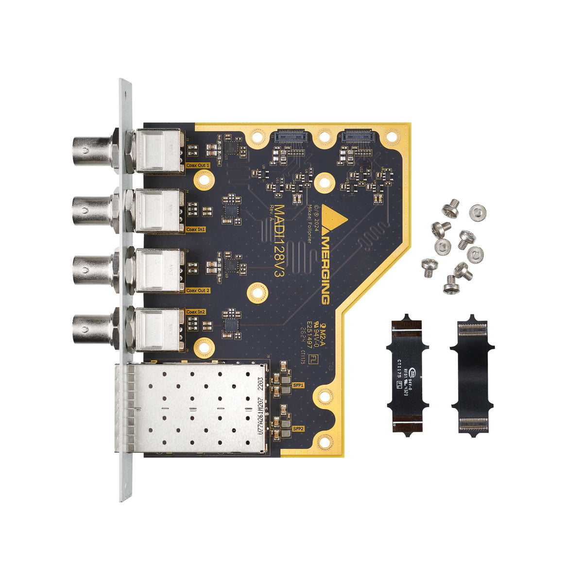 O cartão de expansão Merging MADI128V3 dobra o número total de canais MADI para até 128 entradas e 128 saídas @1FS para o Hapi Mk III. O MADI128V3 também está equipado com dois slots de gaveta Small Form-factor Pluggable (SFP), permitindo a instalação de módulos SFP adequados. Os transceptores SFP para multimodo ou monomodo óptico para transmissão, ou mini BNC para transmissão coaxial, não estão inclusos.